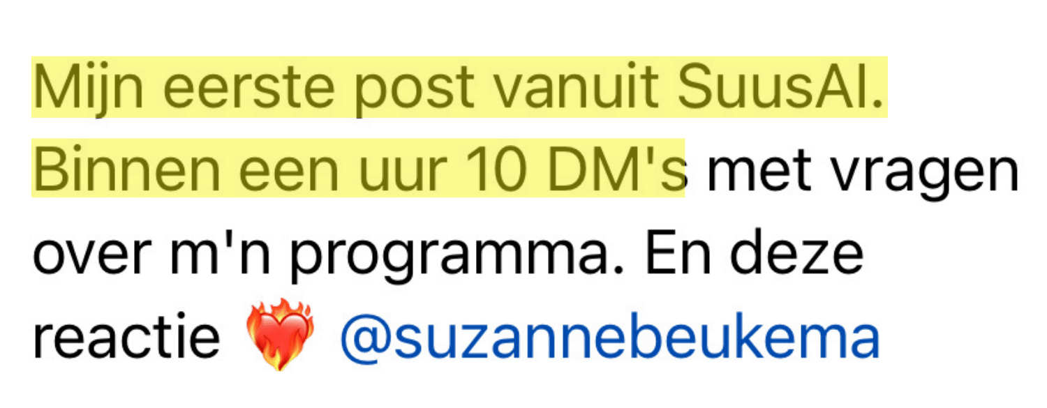 ‘JA zeggen tegen Suus is een van de beste beslissingen ooit geweest. De hechte community van gelijkgestemde vrouwen, de onderlinge support, de samenwerkingen die zijn ontstaan. Maar zeker ook de hotseatsessies en magische livedagen met Suus. In een paar maanden had ik al meer omzet gedraaid dan in het hele jaar ervoor en ik zeg altijd tegen mijn omgeving: ‘er is een leven vóór en een leven na werken met Suus.